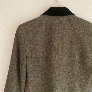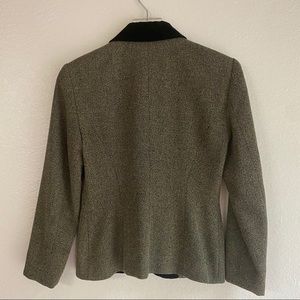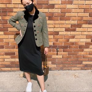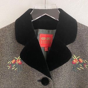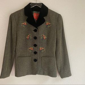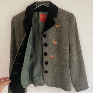 vintage KENZO STUDIO textured green floral embroidered blazer with velvet lapel and button details. in excellent vintage condition. perfect for wearing casually with a black midi dress or dressed up professionally (with flair) with black slacks and a white button up shirt to the office. size 4 and fits true to size.