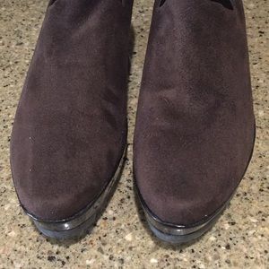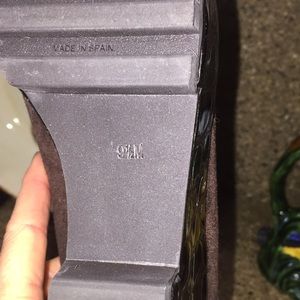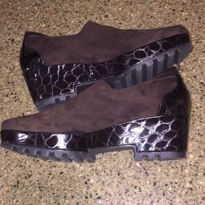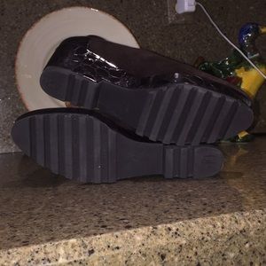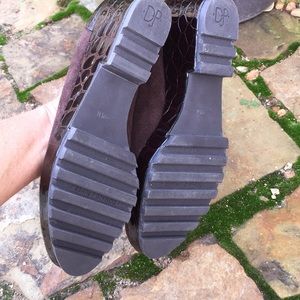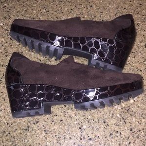 Brown moc croc patent platform loafer. Soft suede slip on loafer. Slight heel effect. Leather inner sole. Rubber no slip sole. Bought and worn very little if at all based on sole. Easy slip on loafer. Smoke free. ❤️