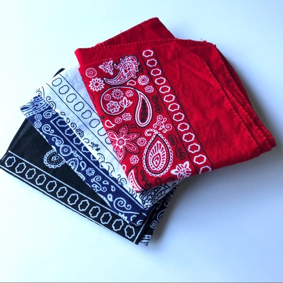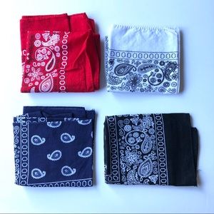 Four pack of bandanas in red, white, blue, and black. 100% cotton and machine washable. Classic paisley style print.