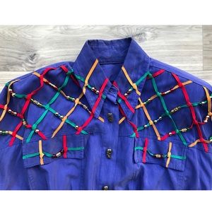 Return to the 1980’s with this oversized, 100% rayon, blue purple bead-embellished vintage collared bomber style jacket. Red, green & yellow suede fabric strips and novel gaudy buttons down the front and at cuffs, accent this retro coat. Large, sewn in, internal shoulder pads and pleated, banded bottom hem.