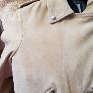 Brand new and unworn All Saints Balfern suede leather biker jacket, with plaited pulls. The softest, most amazing suede leather you've ever felt. The tag says its "yellow" but it is really like a soft light tan, kind of a chamois cloth color (for you car gals), the perfect neutral! Great with all black or all white outfits or flowered flowey dresses. I'm between an XS and S in clothing depending, and this fits well in the shoulders, with a bit of room for a light sweater.