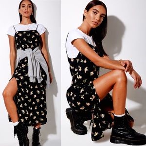 The perfect way to rock florals this Fall, the new Mirza Dress😍. This maxi slip dress has spaghetti straps and a thin fit so it’s perfect for layering with a chunky sweater🖤. The dress has a side slit and a black rose pattern. Slip it on over a white tee with some combats boots for a grungy look ✨.