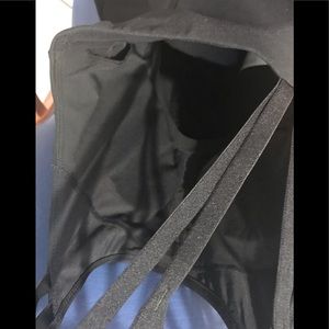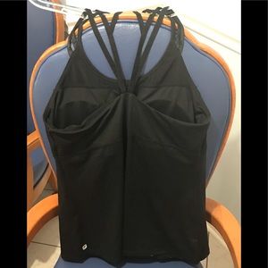 Brand new moisture-wicking all-way stretch fabric; 89 percent polyester/11 percent elastane; built-in shelf bra with removable cups providing medium support; multi-strap back and shoulder detail with fitted body; machine-washable. Size Large (10-12)