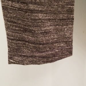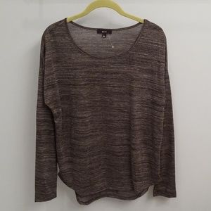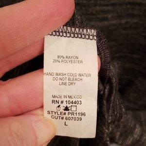 Dark grey/black long sleeve top with faux suede elbow patches from Mine in a size large. 80% rayon and 20% polyester. Slight hi-low effect.