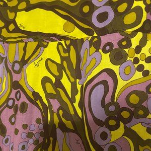 Cute dress by Milly New York. Vintage/retro feel, perfect for a 70's vibe. Vibrant purple, yellow, and brown. Buttons all the way down the front. Collared. Comes with thin brown tie belt.