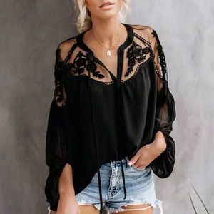 SOLD OUT Black Lace Sheer Tie Front Peasant Boho Top Blouse