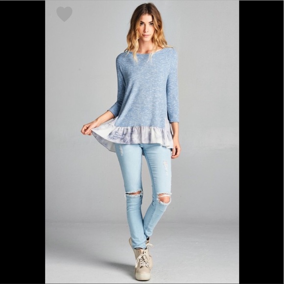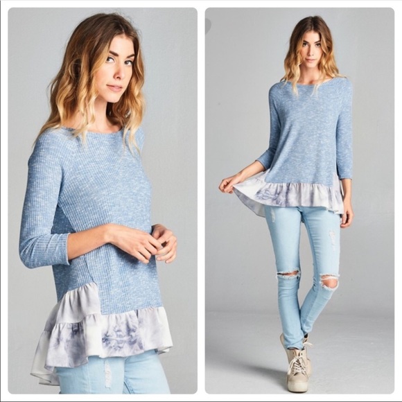 3/4 sleeve rib knit top - blue Heather knit with contrasting blue tie-dye bubble crepe trim. Knit is 60% rayon, 37% polyester and 3% spandex. Contrast trim is 98% polyester, 2% spandex. Super cute for fall with skinny jeans or leggings!