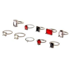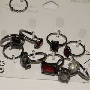 Stack on some dark romance vibes with this set of chic rings! Set of ten hematite-tone rings features dark gray and deep red stones.