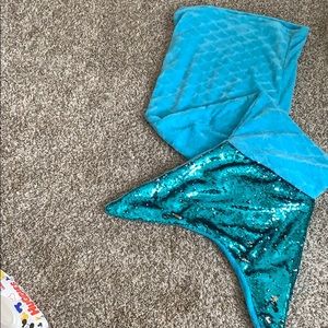 (294) Blue mermaid tail blanket with reversible silver sequins! I’m 5’4 and it goes up to my neck! Never been used, just laying around! Not all sequins are perfect, but not noticeable!