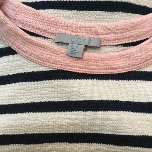 Cos long sleeve beige background with black stripes and a mauve neckband and long sleeves.