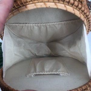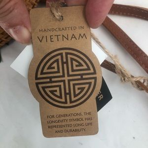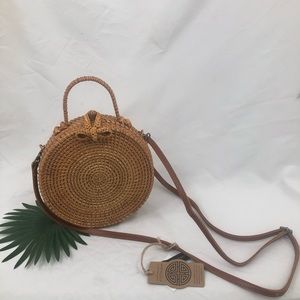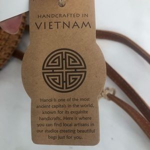 Round rattan tan wicker purse With handle genuine leather strap that is removable and adjustable white interior with pockets with handle genuine leather strap that is removable white interior with pockets made in Vietnam brand new it tags