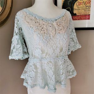 Light blue and cream lace peplum top from Free People. Size XS. Light blue lace peplum top features cream lace at bust, short flutter sleeves, keyhole back with button closure, and slightly cropped fit - shorter on the sides. See pics for measurements and fabric content. Very good condition. Comes from a smoke-free home.