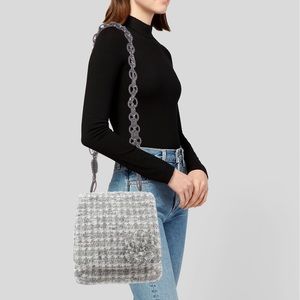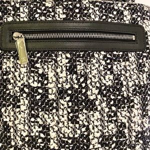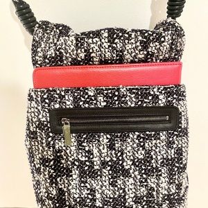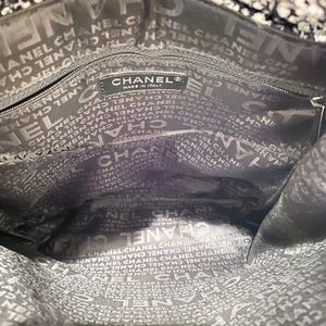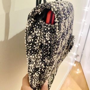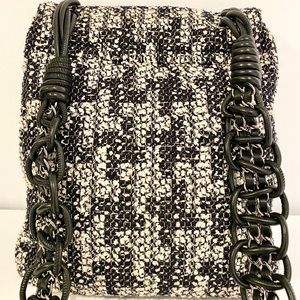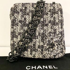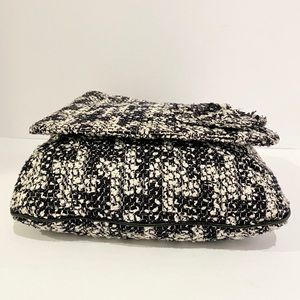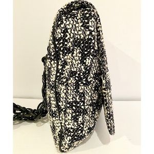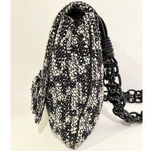 Featured in the Fall 05/06 collection this beauty features black & white tweed, SHW, black leather trim, chain-link & leather shoulder strap, tonal tweed Camellia embellishment, single pocket under front flap w/zip closure, black logo jacquard lining, single pocket at interior wall w/zip closure & flap closure at front.