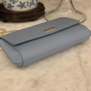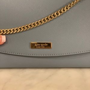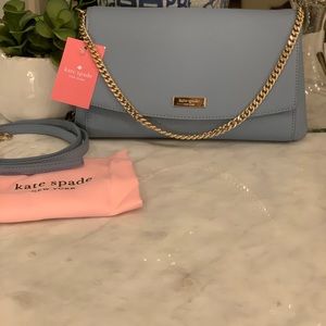 PRECIOUS KATE SPADE ♠️ CLOUDCOVER BLUE SAFFIANO LEATHER HANDBAG. HAS PRETTY GOLD TONE HARDWARE. CHAIN STRAP TO CARRY AS A DANTY HANDBAG OR SHOULDER BAG. REMOVABLE ADJUSTABLE CROSSBODY STRAP THAT