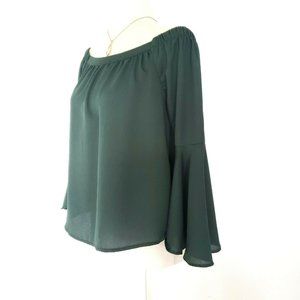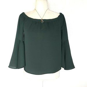 Haute Monde off the shoulder blouse in a women's size medium. Forest green with bell sleeves. Excellent pre-owned condition with no noted flaws.