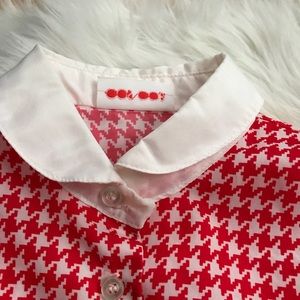 Vintage Peter Pan Collar Red and White Houndstooth Button Down Shirt. Size and material unknown. Model wears a size 2. Best guess size small-medium. Probably polyester. 37” bust. 35” waist. 24.5” long. Very good condition. 038