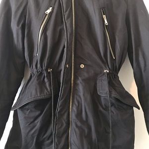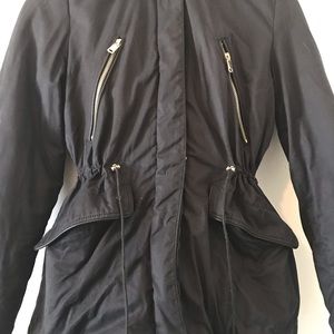 With sin he’s waist line, zipper on sleeves, functional strap for carrying and warm and cozy faux fur lining. Freshly washed in dark blue.