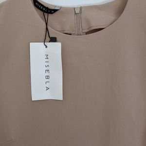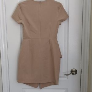 New with tags, Misebla beige short sleeve dress, with a beautiful ruffle at the bottom that leads into the front slit. Dress is unlined with zipper at the back. Small pinprick or snag at the front bottom as shown in the photo - unfortunately I ordered online and can't return it due to shipping and customs already paid on it, it would be too costly to return.