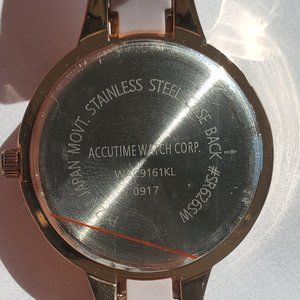Super cute pink/gold watch by Accutime. Watch features a crystal crown, pink synthetic (runner) band with 8 notched fittings, mother-of-pearl inner-face and roman numeral digits. Watch is in beautiful condition. Back has original plastic protector (pictured).