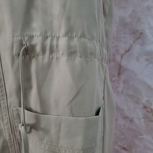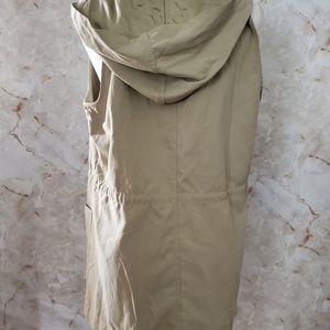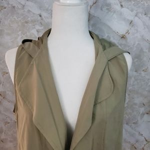 Notched collar; draped, open front. Sleeveless. Drawstring waist. Side-slip pockets. Straight hem.