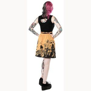 Brand new with tags, black and orange Haunted House dress by Sourpuss. Cute border print with haunted houses, cats, bats, everything that you love about Halloween!