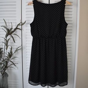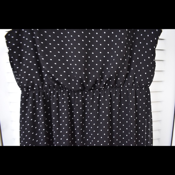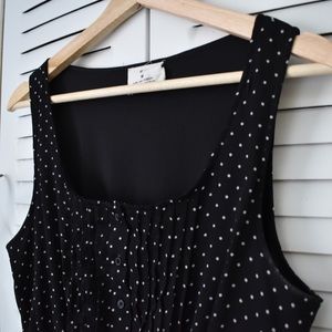 Above the Knee, A-Line, Modest, Sleeveless, Polka Dot Black and White Dress with (Fashionable) Buttons and Ruffles on Chest