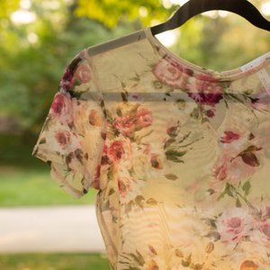 Mesh bodysuit covered in pink floral pattern.