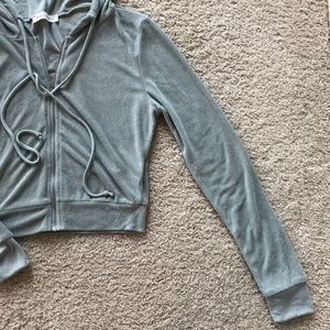 Sage Color Hooded, Cropped Jacket. Super cute, easy to throw on and go, or great for lounging. Long sleeves. Front zip. 78 modal 22 polyester.