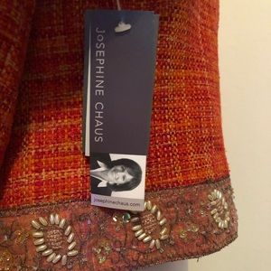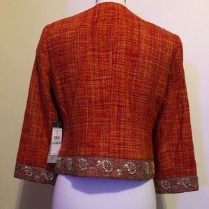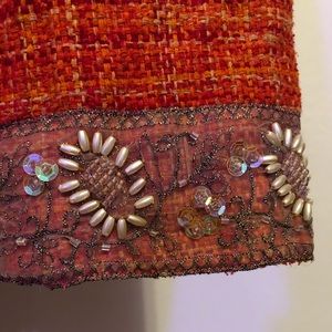 Brand new with tags still attached! This gorgeous orange tweed jacket hooks closed in front and features stunning beading. Size 8 petite. Measures approximately 19” long from shoulder to hem and 19” across from pit to pit when laid flat. 100% silk material with 100% polyester lining.