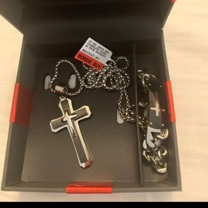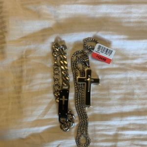 NWT Men’s JC Penny jewelry set. Necklace and matching link bracelet. Made of strong stainless steel. Will not turn. 18” chain. Smoke and pet free home. Please lmk if you have any questions. Thanks for stopping by my closet and Happy Poshing 🙂
