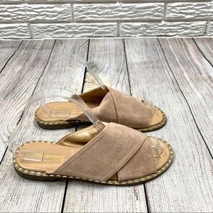 Mauve faux suede criss cross slip on Saige sandals / slides with gold stud accents by Maurices.