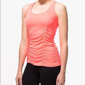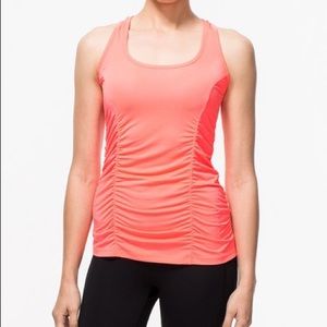 This comfortable workout top features a cooling racer back, flattering ruched seams, and a bold blue color.