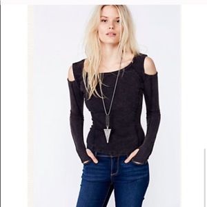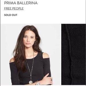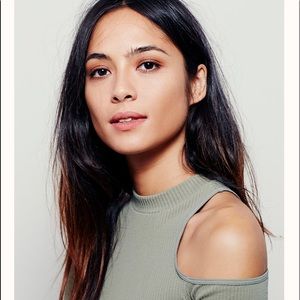 Stretchy ribbed cold shoulder top with mock turtleneck.