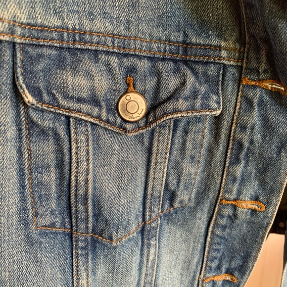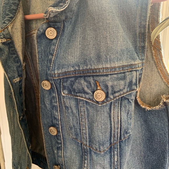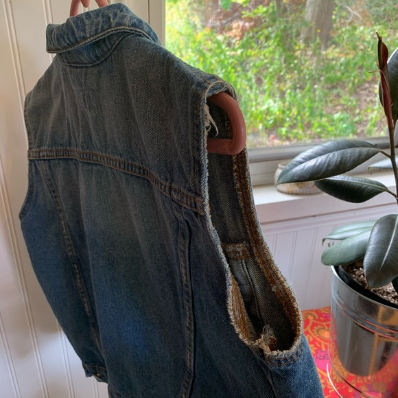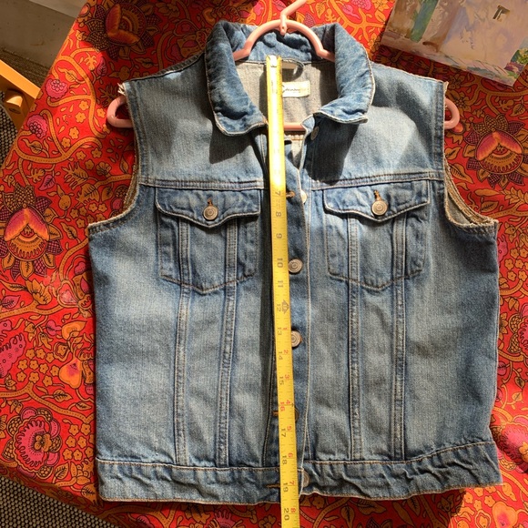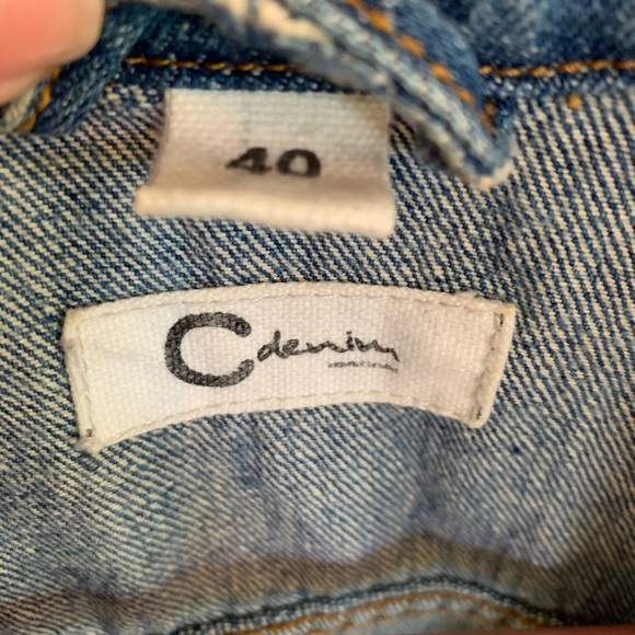Women’s C Denim vest purchased at a thrift store in Norway, marked size 40 fits like small-medium. Measurements in photos. Minimally distressed/frayed arm openings. Good quality 100% Cotton denim—perfectly broken in but still has structure. Shown worn by person who is 5’7” 135lbs