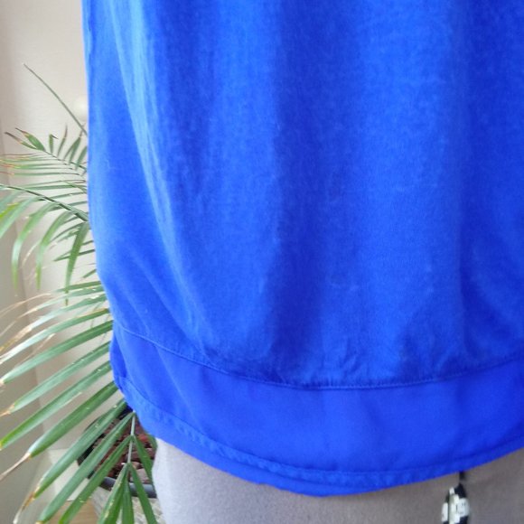 This nautical blue rayon blouse has sleeves, yoke, and hem band in a matching polyester chiffon. Yoke and hem pieces are lined and the sleeves are unlined.