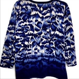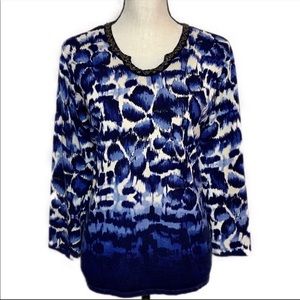 Very pretty mid-weight ombré sweater in blues and oyster white. Subtle gold-tone embellishment at neckline; 3/4 sleeves. Excellent pre-owned condition. Private collection piece.