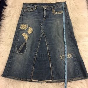 One of a kind! Custom tailored denim midi skirt with so much detail to offer! Lace, sequins, large stitching, natural fray, beading, destruction.....I could go on & on! This was made from a pair of lucky brand jeans & the seamstress did a phenomenal job! If you are looking for a custom distressed piece then this is for you! Please refer to all of the photos b4 purchase for all details, condition & measurements. Great used shape & SF home. No known flaws. Worn look is native to the item. Ty 4 👀!