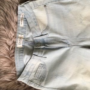 Destructed light wash jeans. Super skinny fit. One tiny spot on the back. See last picture.