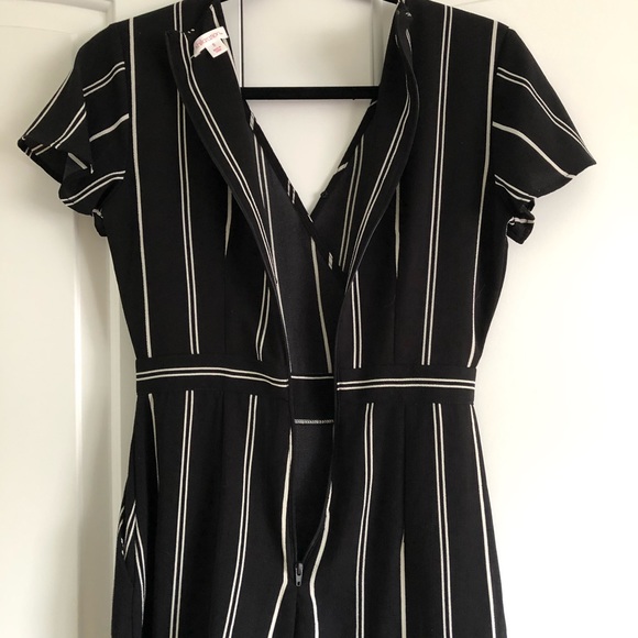 Black romper with white stripes. Two pockets. Long zipper on the back. V neck with little button to close. In excellent condition.