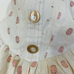 Cream color with pink metallic polka dots and metallic foil stripes throughout. Elastic back, strapless dress.