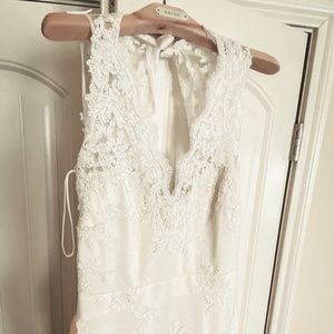 NWT. BHLDN x Badgley Mischka Collection. An elegant combination of crepe and romantic lace, Badgley Mischka's silhouette-skimming gown steals the ceremony with its open, circle cutout back. Back zip with hook-and-eye closure. Polyester, spandex, nylon; polyester lining. Dry clean.