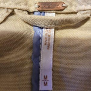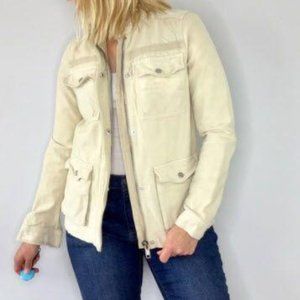 Frayed hems & sleeves, zip front, 4 front snap pockets, stand up collar, back vent with snap buttons, relaxed fit, unlined.