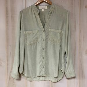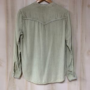 Anthropologie Cloth & Stone green stonewashed shirt in excellent condition. Zero stains or flaws of any kind. Hi-lo hemline, western style back, frayed accents, super soft tencel material. Size small with measurements below.