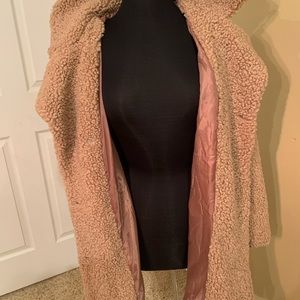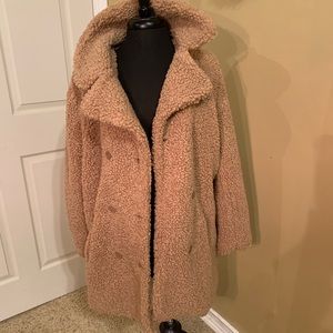 Long and beautiful. Double button in front. Never wore it, because it didn’t get cold enough here. ;) It’s a soft brown/khaki color. Size small but fits more like a med.