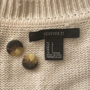 Classic knitted button down cardigan. 100% acrylic. Missing top button, but I will send two replacement buttons (see last picture).
