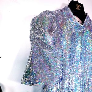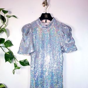 New ASOS EDITION 80's Sleeve Sequin Iridescent Bow Back Silver Metallic Glitter Mini Dress 8 M Medium