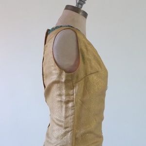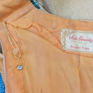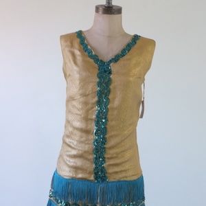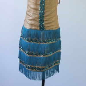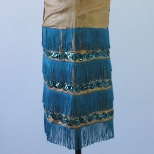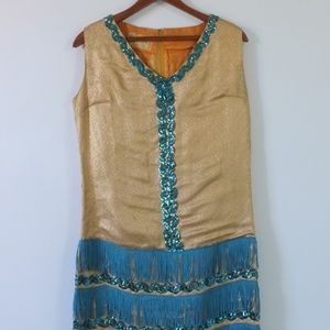 Vintage '60s-does-'20s flapper dress! Amazing gold metallic bodice w/rows of glorious blue fringe that swing & sway w/every step! Metallic blue sequins v-neck, down the front & between fringes. Back zip closure, fully lined.
