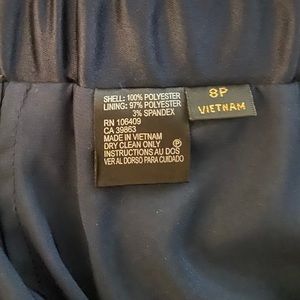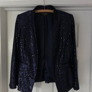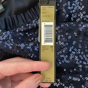 New with tags Tahari petite navy suit. Beautiful structure and covered with sequins. Shell is 100% polyester. Lining is 97% polyester and 3% spandex. Pant leg has a beautiful flare. Wonderful statement suit. Size is 8 petite.