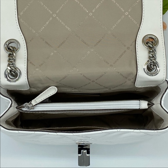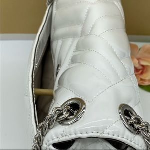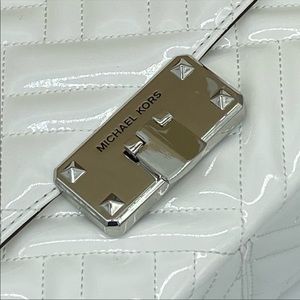 MICHAEL KORS PEYTON MEDIUM SHOULDER FLAP OPTIC WHITE 35SOSP6F2A • Shoulder bag • Patent Polyurethane blend • 68% polyurethane/32% polyester • Silver-tone hardware • 9.25”W X 7”H X 3.25”D • Interior details: back zip pocket, center zip compartment, front and back slip pockets • Lining: 100% polyester • Flip-lock fastening • Imported