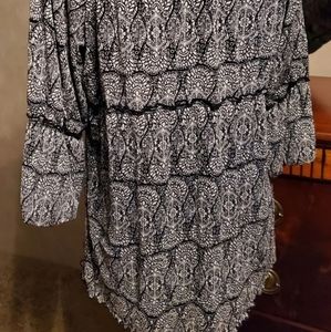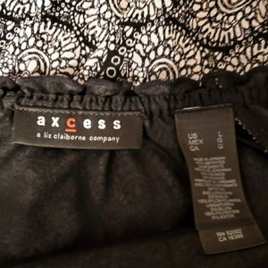 Axcess Womens Top. Black and white geometric design. Pleasant style neckline, gathered under bust and at elbows. 3/4 sleeve. Purchased from Kohls. Excellent used condition.